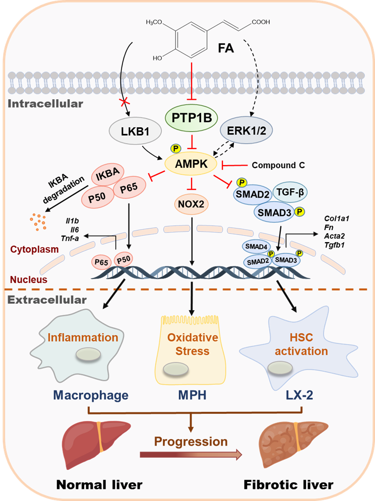 近日,best365生命科学学院李晓骄阳教授在影响因子5.81分的杂志Frontiers in Pharmacology(药理学JCR一区)上以通讯作者,best365足球官网生命科学学院为第一完成单位发表题为“Ferulic acid ameliorates hepatic inflammation and fibrotic liver injury by inhibiting PTP1B activity and subsequent promoting AMPK phosphorylation(阿魏酸通过抑制蛋白酪氨酸磷酸酶1B活性进而促进AMP依赖的蛋白激酶磷酸化改善炎性肝纤维化)”的学术论文,该研究采用基于分子对接、表面等离子共振及免疫共沉淀等多种分子生物学技术,系统性阐明了中药单体成分阿魏酸对肝脏炎症和纤维化的治疗作用及其潜在机制。该研究为中药天然产物治疗肝脏纤维化和其晚期并发症提供了重要的理论支持。