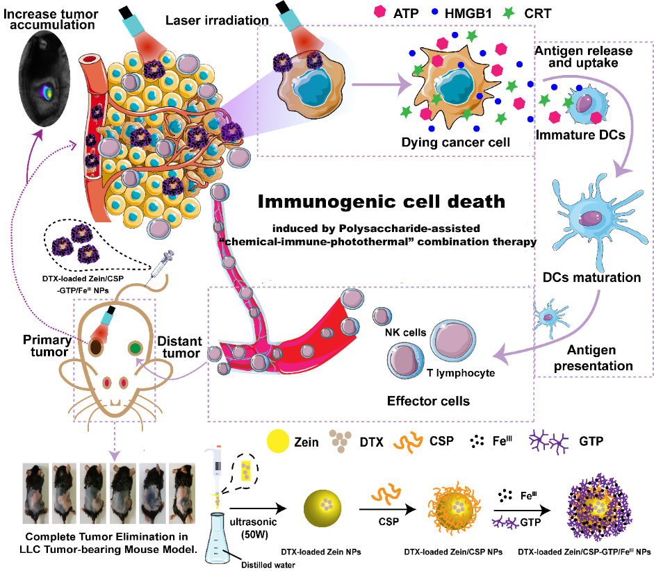 团队选取化疗药物多西他赛、光敏剂(茶多酚/铁离子膜)以及锁阳多糖形成“化学-免疫-光热”联合疗法模式,其中化疗与光热治疗联用可诱导产生强于单一疗法的ICD效应,锁阳多糖调节免疫系统,进一步放大ICD效应,帮助机体建立持久的抗肿瘤免疫应答。此外,将联合疗法模式与纳米运载体技术相结合,构建“一体化”的载药纳米平台,用于癌症的靶向治疗,进一步提高了抗肿瘤疗效。该载药纳米平台在不同的荷瘤小鼠模型中均能显著抑制原位瘤及远端瘤的生长,且具有良好的生物安全性。这种基于中药多糖的“一体化”载药纳米平台为中药多糖在癌症治疗中的应用提供了理论指导及实验基础。