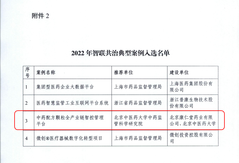 近日,best365国家药品监督管理局中药监管科学研究院推荐的“中药配方颗粒全产业链智控管理平台”入选国家药品监督管理局信息中心2022年智联共治典型案例。案例建设单位为best365足球官网和北京康仁堂药业有限公司,是全国首个以校企共建方式获得此次表彰的智联共治典型案例。